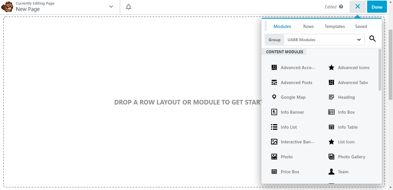 3. Under Modules tab, selct UABB Modules from the Group select bar and begin using the modules you wish to add on the page.