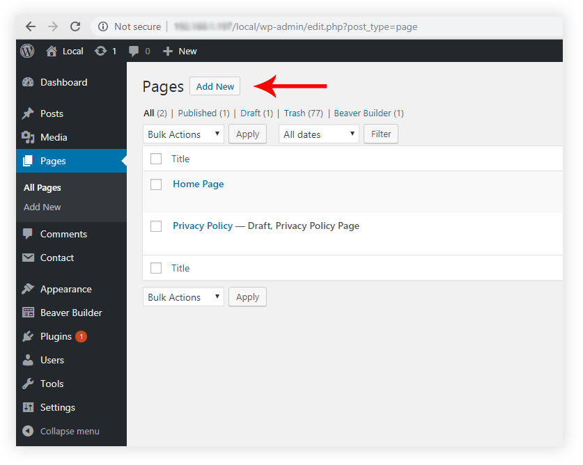 In the WordPress Dashboard, click on Pages and then “Add New”
