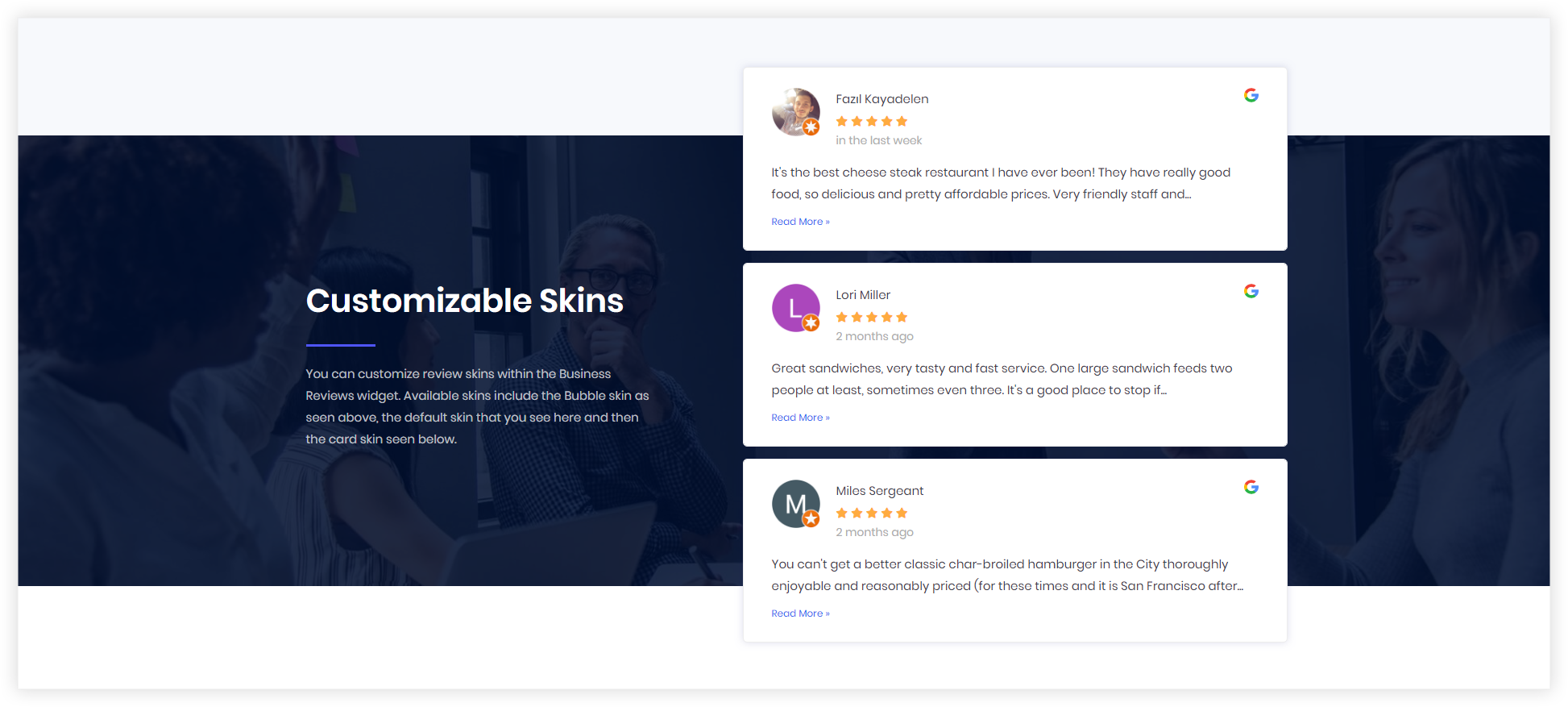 - Skin ( General > Skin > Select Style ): This arranges review meta information like date, ratings, reviewer image, name, etc. in different positions. So that you can display review as card, bubble or default box.
