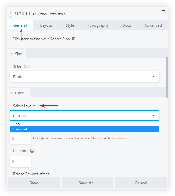 - Grid & Carousel Layout ( General > Layout > Select Layout ): This will set all reviews in the grid or carousel (slider) layout. Layout tab also offers a setting for a number of Reviews to Show. Select the number of Google (maximum 5) and Yelp (maximum 3) reviews to display.