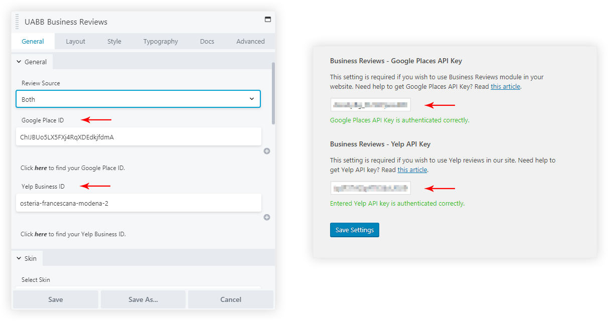 Displaying Google and/or Yelp reviews require you to render the ID for your business. This helps the module to connect to your business and fetch the respective reviews. Under General > Review from, choose if you wish to display Google and/or Yelp reviews.