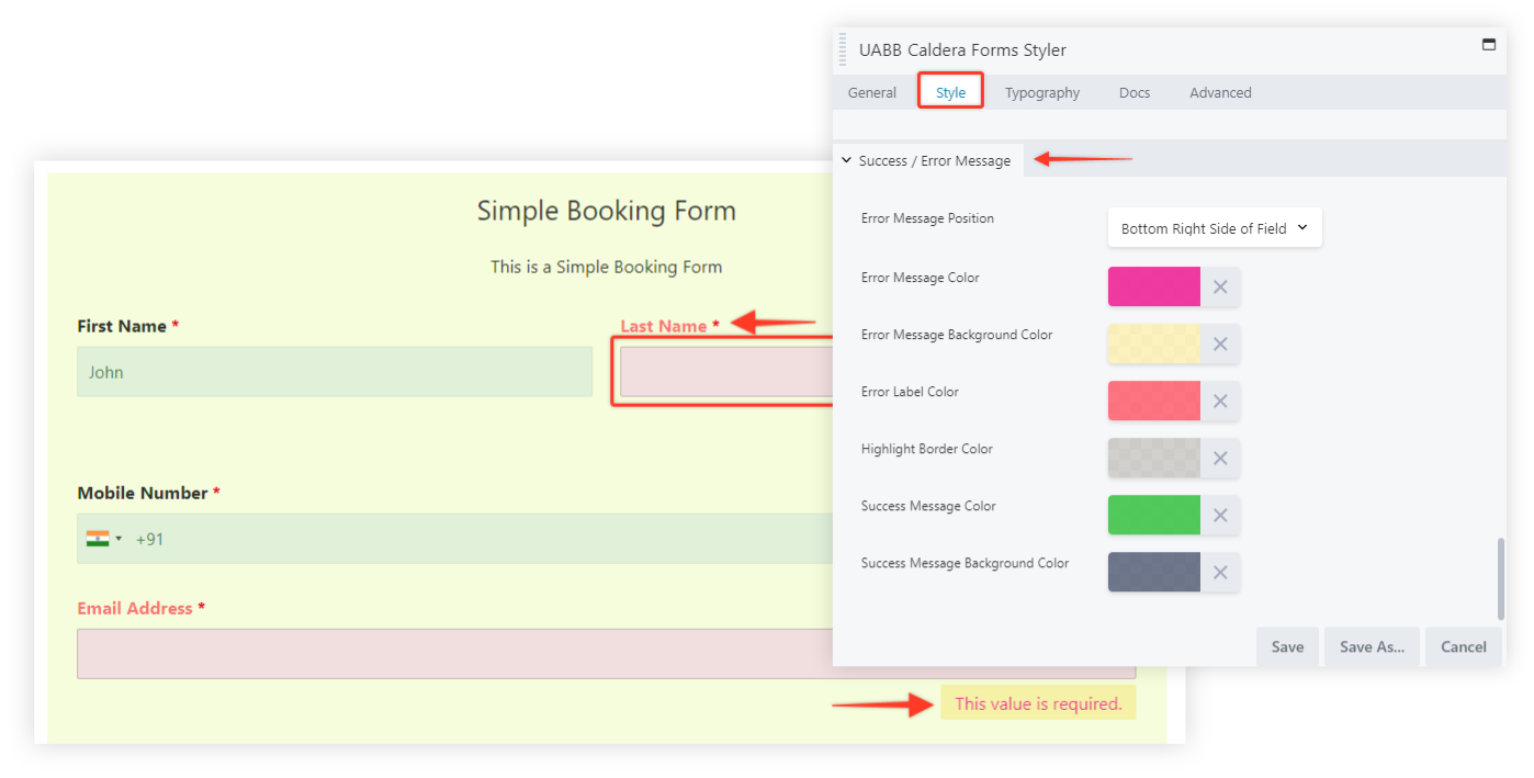 The settings in this section allow us to set a different Position for the Error message and also allows to set various colors for the Error message or Success Message including changing the Background Color of the Input fields.