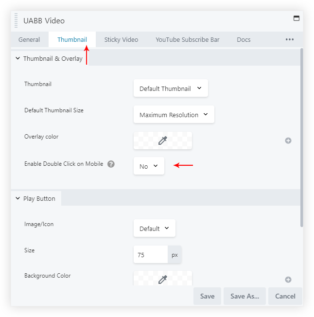 With UABB – Video module, you can set a custom thumbnail image for the video. When the thumbnail image is set and the video is viewed on mobile, it takes two clicks to play the video. To choose whether to display two clicks or the thumbnail image, we have added an option Enable Double Click on Mobile under video options for both YouTube and Vimeo.