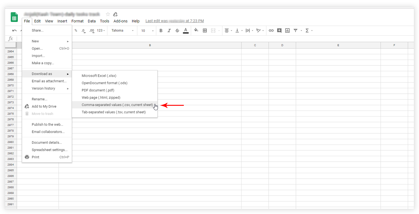 Click on File -> Download as -> Comma-separated values (.csv, current sheet)