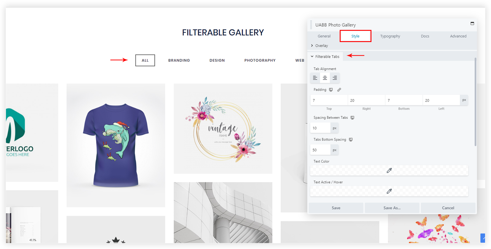 - You can completely customize Filterable Tabs from Style and Typography options.
