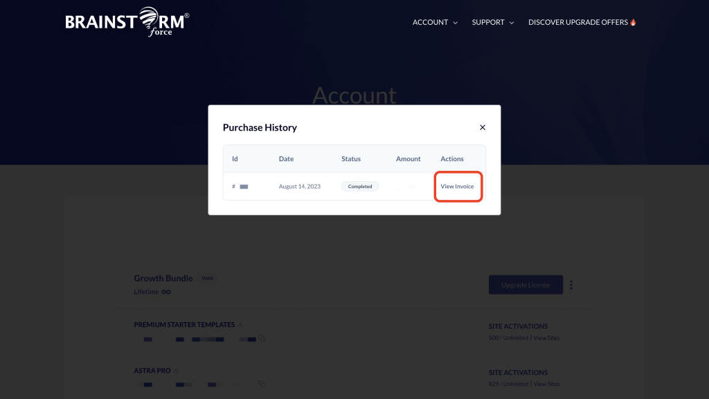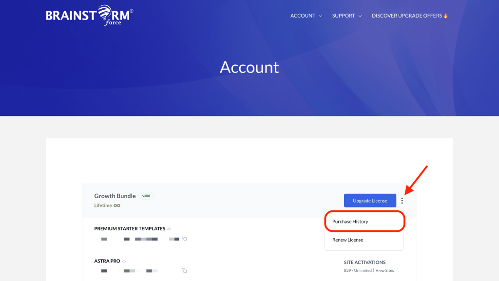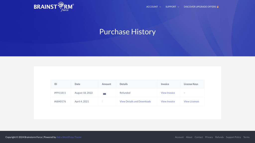 1. Login to your account and open the following page: https://store.brainstormforce.com/purchase-history/