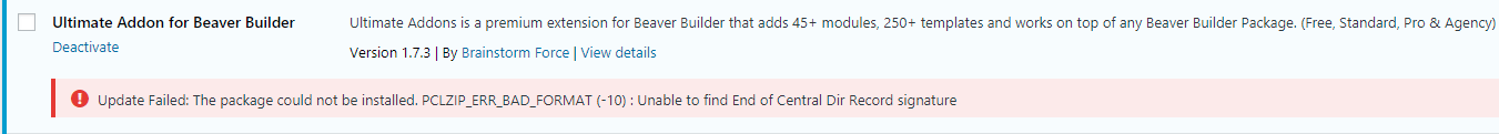It’s possible that the plugin zip file became corrupted when it was downloaded. Try downloading it from your account on our store and install (or update manually)