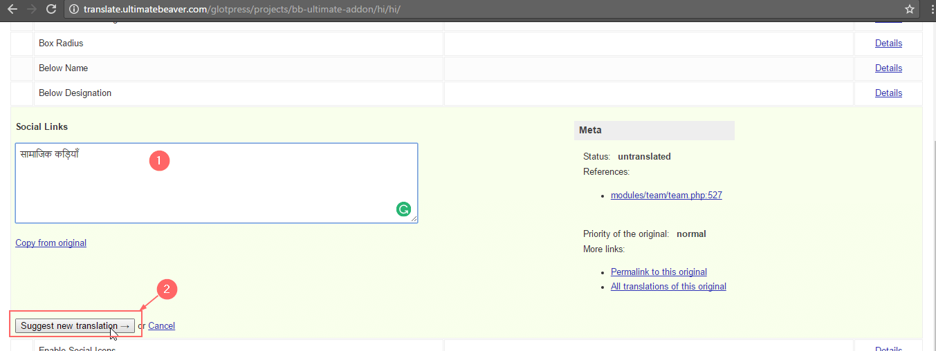 - Add your translation in the text box and click suggest new translation (screenshot)