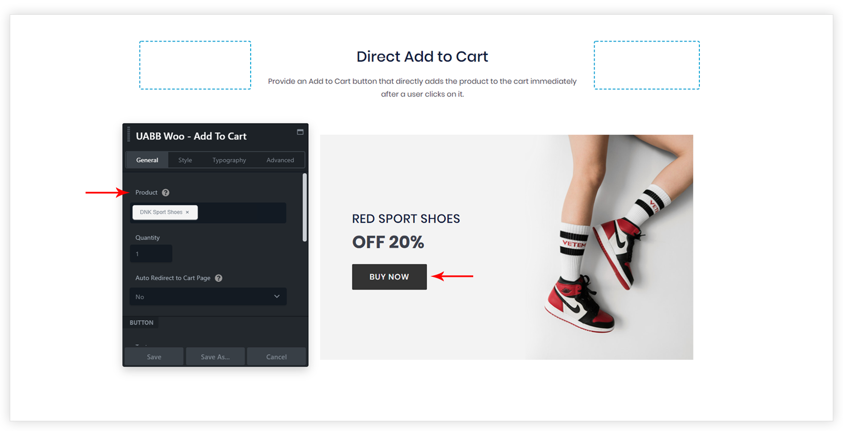 – Start typing name of the product that you wish to add to the cart when the user clicks the button. Also, choose the Quantity.