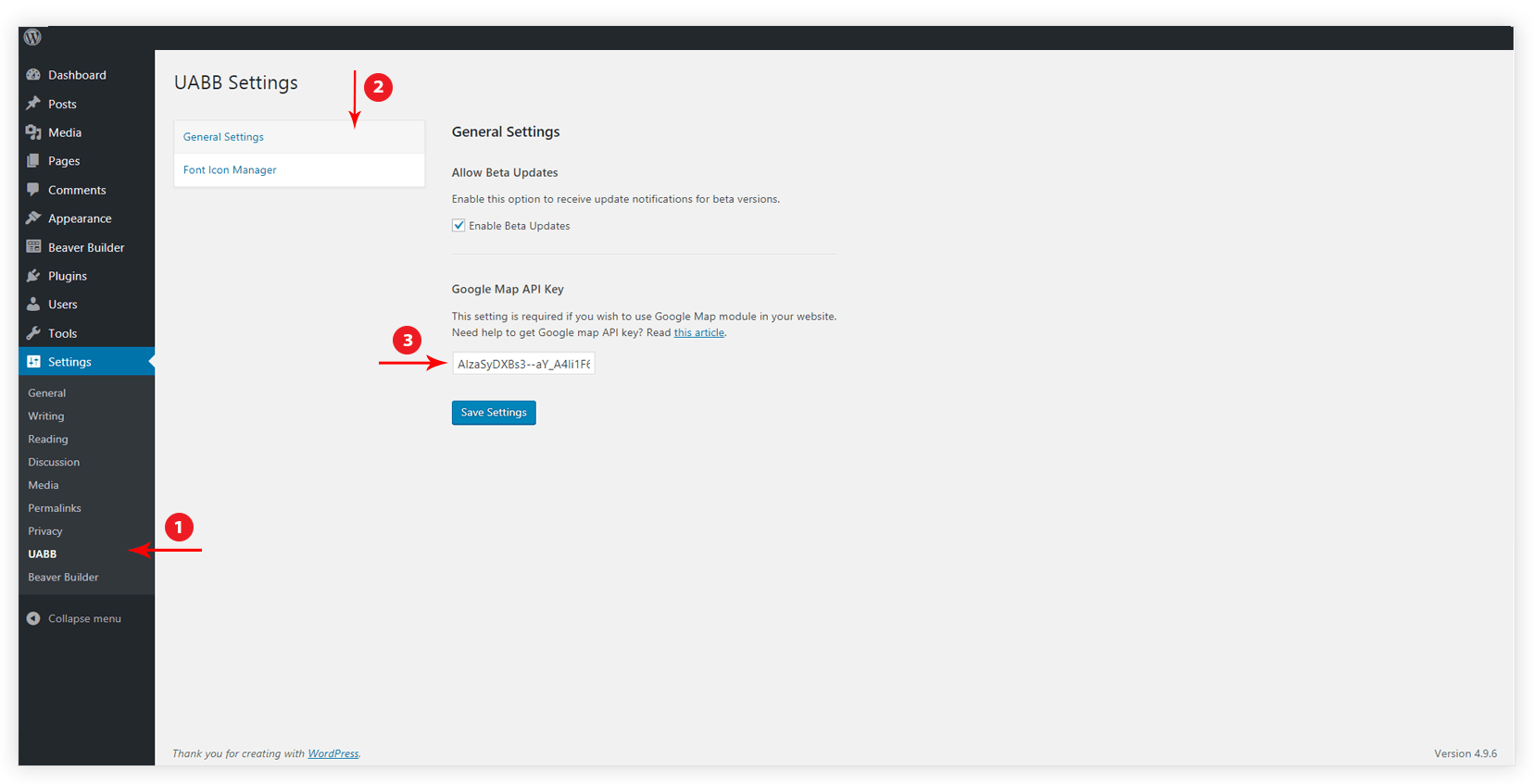 From the WordPress dashboard, navigate to Settings -> UABB -> General Settings > Google Map API Key.
