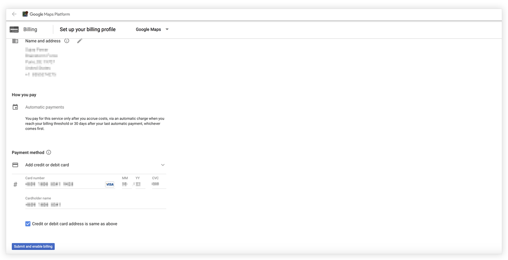 Step 5 – Choose the Payment method and add payment details. Click Submit and enable billing.