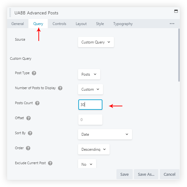 Step 1: Let’s say you have 30 number of posts and under the posts, you want to display the pagination. So you would need to set the Posts Count to 30 from the Query Tab of the module. Refer below image