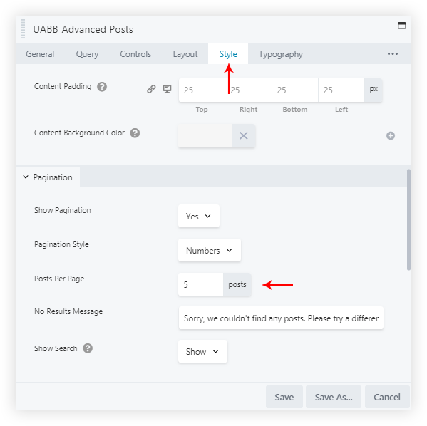 Step 2: Now under the Style tab of the Module if you would need to set Posts Per Page to 5. This would display 6 pagination Numbers below the Grid Layout of the Advanced Posts module.