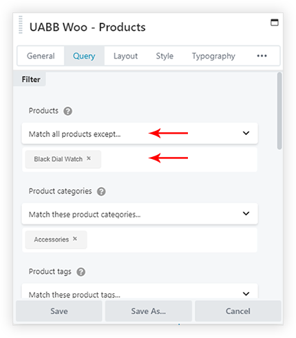 The Query Builder of the Woo – Products module allows you to either display All Products or filter them as per your requirements. You can exclude particular products from a particular list using options listed under the Query tab.
