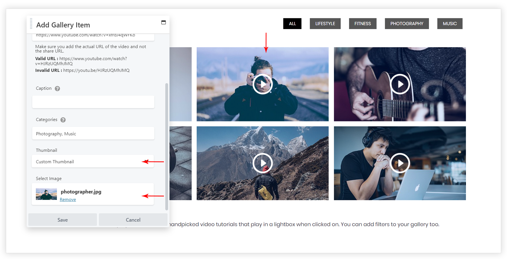 When you add a video to the galley, the default placeholder image will display before playing a video. You can override this with a nice custom thumbnail that gives a finishing touch to the video gallery.