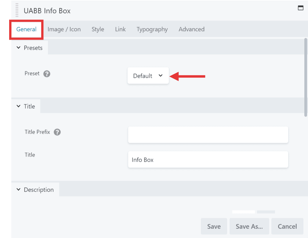 While working with UABB modules, you can simply choose any style from a list of professionally designed, sleek, and classic presets. Presets will help you quickly create great designs. You can select the preset of your choice here. But before changing presets, save the content, you added to the module. Otherwise, your content will be overwritten with the default one.