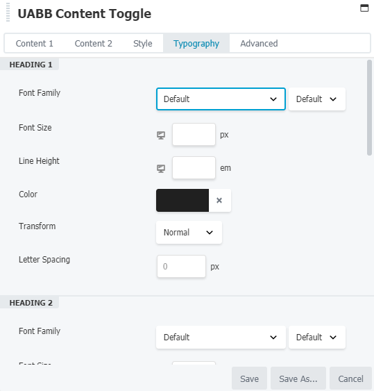 Using this tab you can change the Heading 1, Heading 2, Content 1 and Content 2 typography like Font Family, Font Size, Line Height, Color, Text Transform, and Letter Spacing.