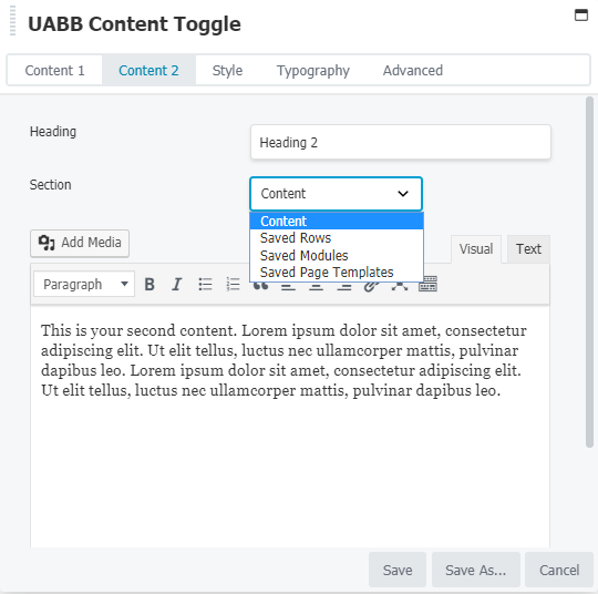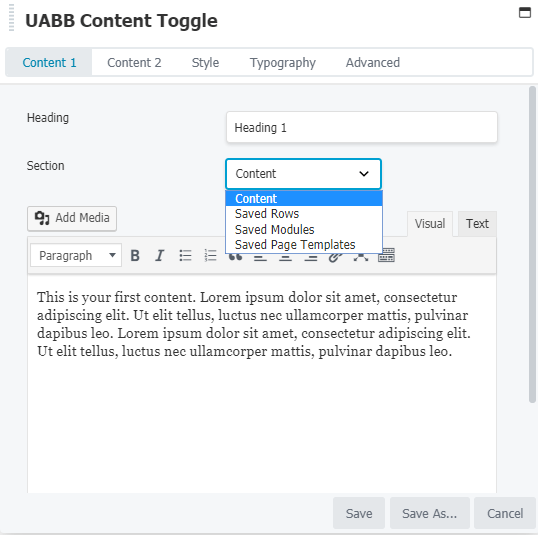 Content Toggle module helps you display two versions of a content, saved row, saved module and saved page templates within a single section allowing users to toggle between them using the toggle button.