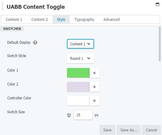 You can choose which content you wish to display by default. You can change the switcher style( Round 1, Round 2, Rectangle, Label Box ). You can change the size, colors for switcher and controller.