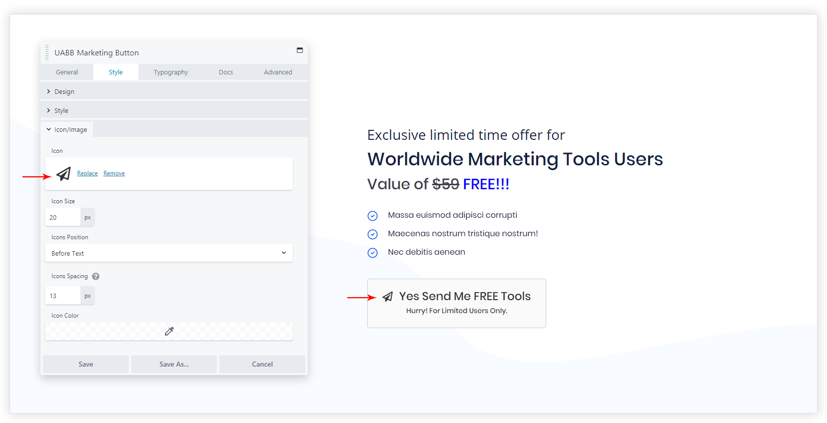 icon and set its size, position, spacing - Customize button with background and spacing options