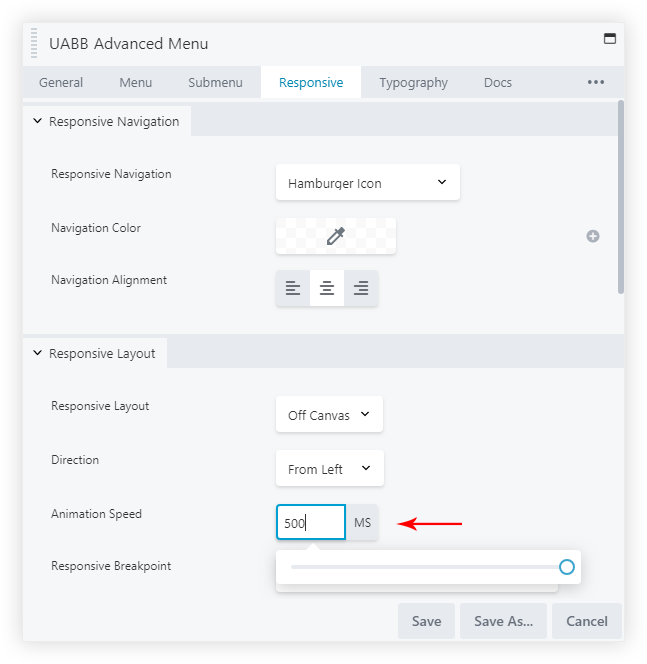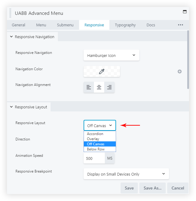 Select Responsive Layout > Off Canvas in the Responsive Tab.