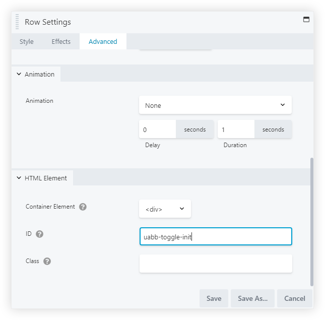 Step 1: Add an ID uabb-toggle-init to the parent row of Content Toggle. Note that add ID uabb-toggle-init only. Other ID will not work.