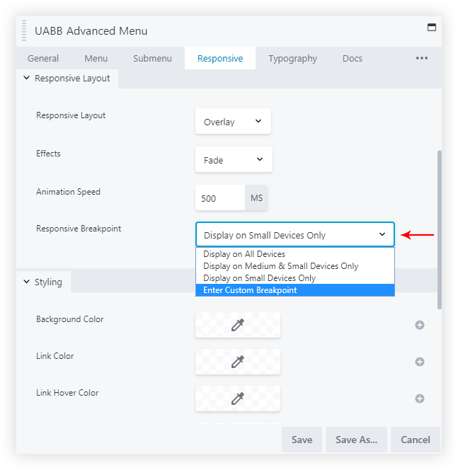 Enter Custom Breakpoint: Select Custom to enter a custom breakpoint.