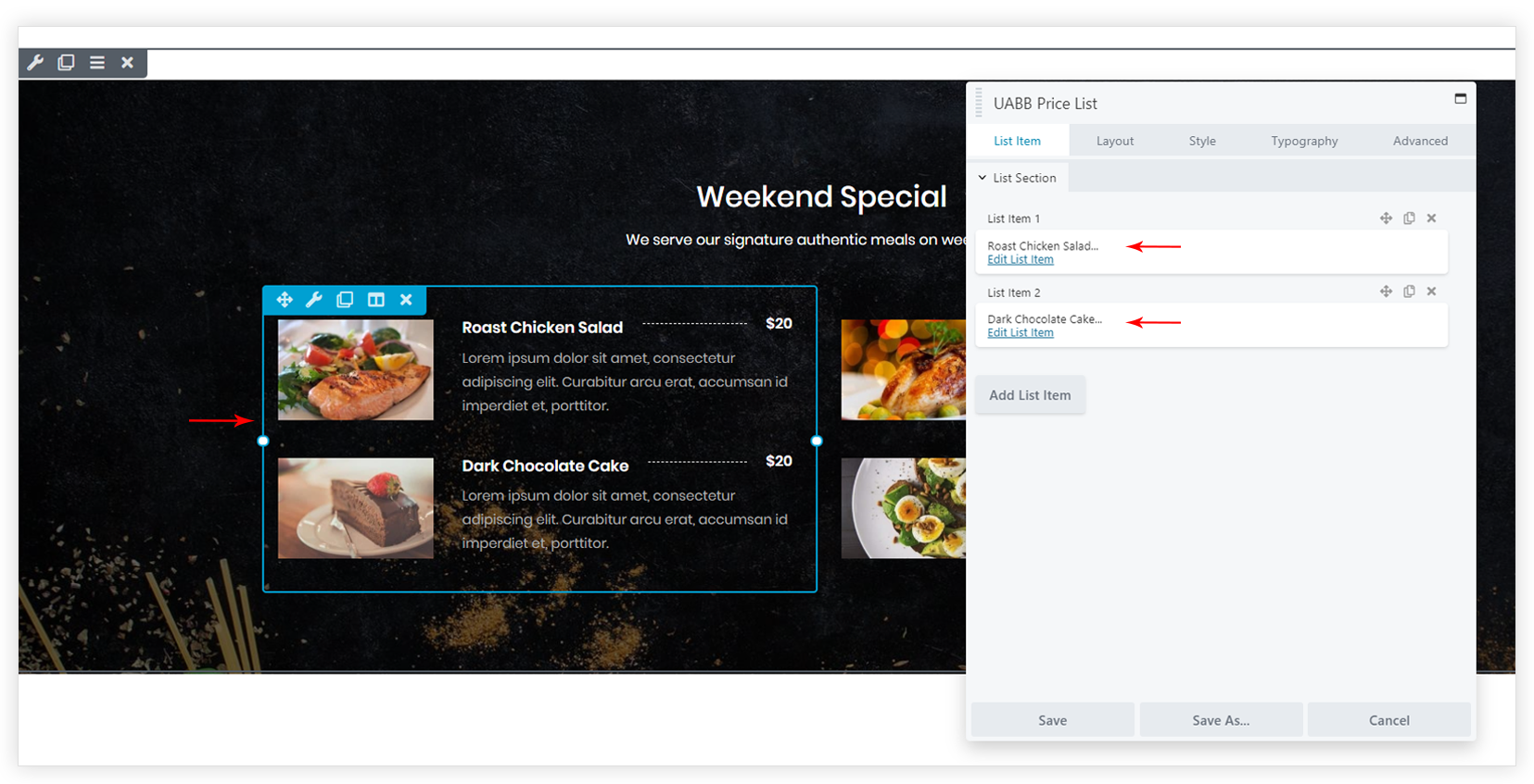 Module allows adding all required details for each list item. Under List Item > List Section you will find options to create all  list items.  You can even add normal and discounted price foe the items under sale.