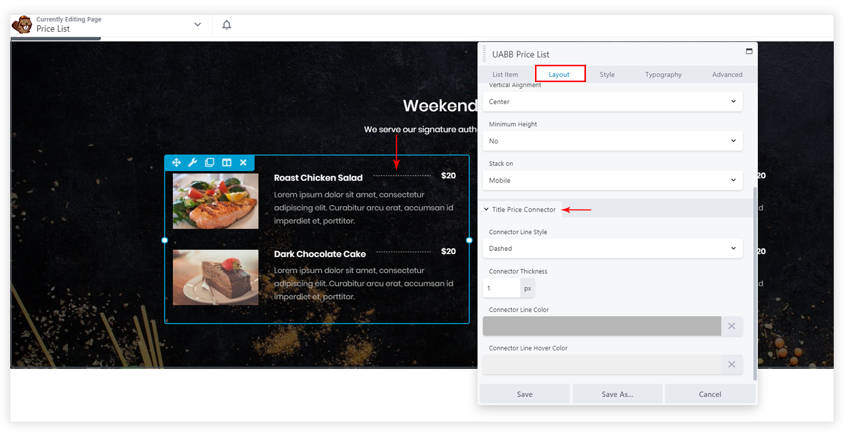 A line between list item title and price can be customized completely from Layout > Title Price Connector