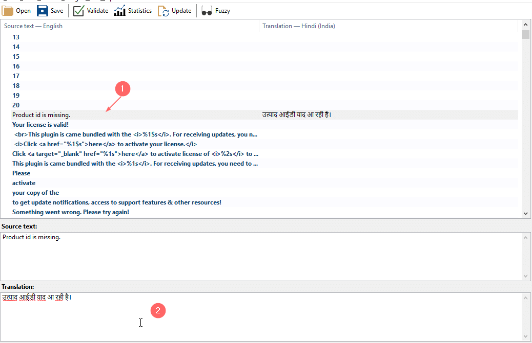 5. After you are done translating all the strings, click save. This will give you .mo and .po files.
