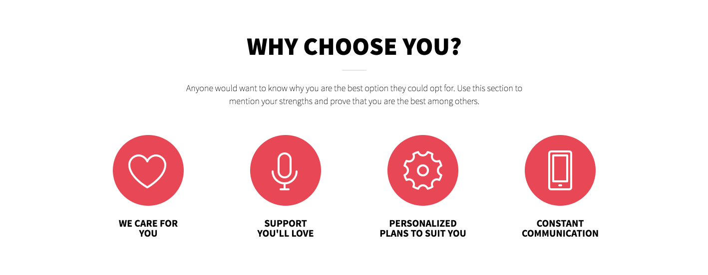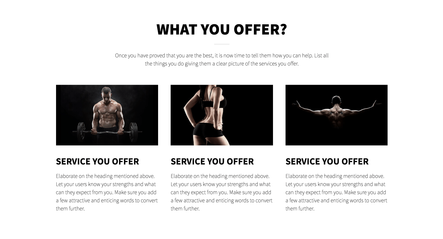 Now, that a visitor has scrolled down to know more, it’s time to speak about your services. This gives him an idea about the various ways you can help him in.