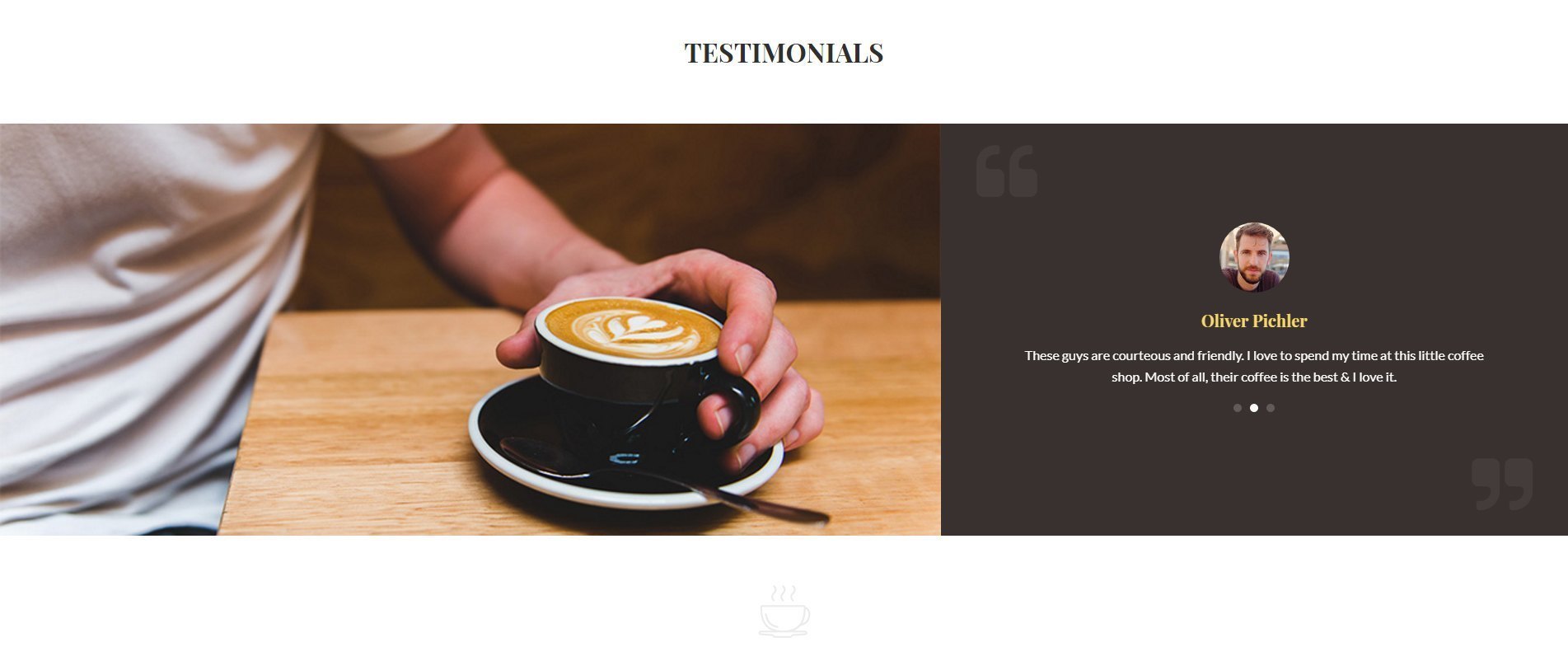 Whether you have a huge restaurant or a tiny coffee shop, having a face online promises more viewers and brings in customers into your shop. This page template is designed keeping in mind a local coffee shop or a cafe that offers some awesome coffee just like you!