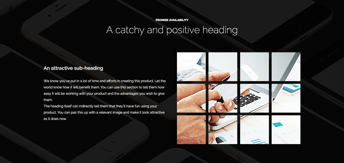Have something more to share about the product? You can do that in the third section. With a clear title, a few lines of text and a relevant image, you can introduce what the product or service is all about.