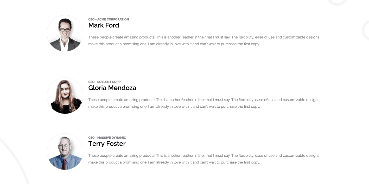 After having spoken about the product and its features, you can then tell them who you are and how the world has been trusting you. The next section can be used to display a list of clients you’ve worked with or some industry heads that have spoken about your products in the past. This will serve a great feather in the hat, you know!